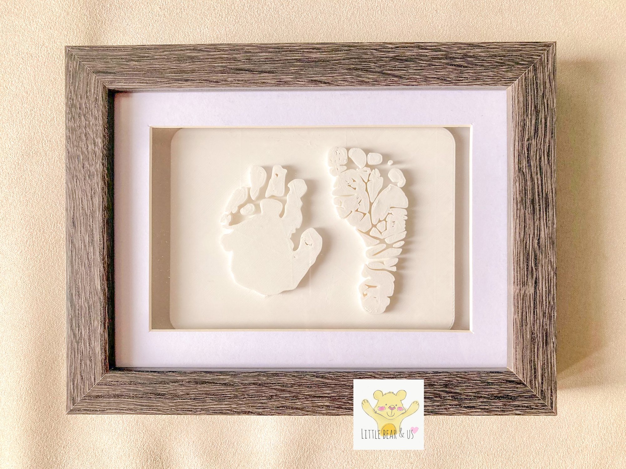 These are made from PLA, a biodegradable cornstarch based bioplastic, customised to your little one's hand, footprint or both. These can be scaled to approximate size. The plaque itself will be ~14cm wide and are sent unframed.